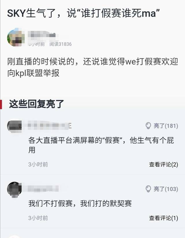 WE被质疑打假赛事件引起了热议以后,SKY作为WE战队的老板之一,也很快出来澄清这件事了,SKY直接说了一句话,弹幕瞬间炸裂“谁打击赛谁死ma。”