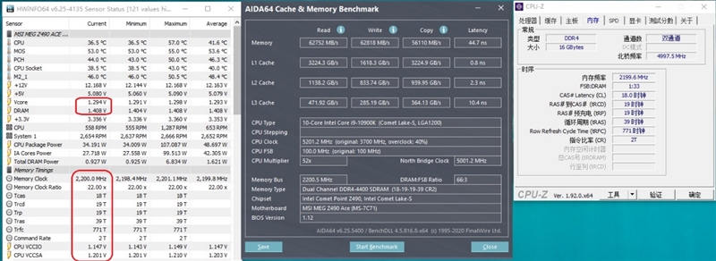 在内存超频这一块,MEG Z490 ACE主板也没让人失望。在BIOS里面“Memory Try it!”中选择DDR4-4400 C18选项,实际时序竟然是18-19-19-39 CR2,能在4400MHz频率和1.4V的电压下达成这样的时序并通过了内存稳定性测试,的确是让人意想不到。