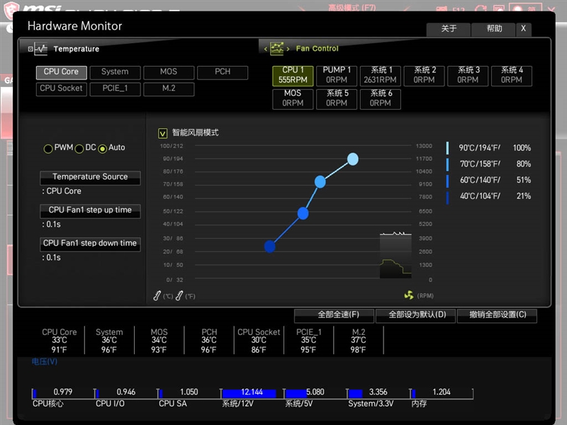8个风扇都可以单独依据CPU、MOS、主板或者机箱内部温度来设置温度曲线。