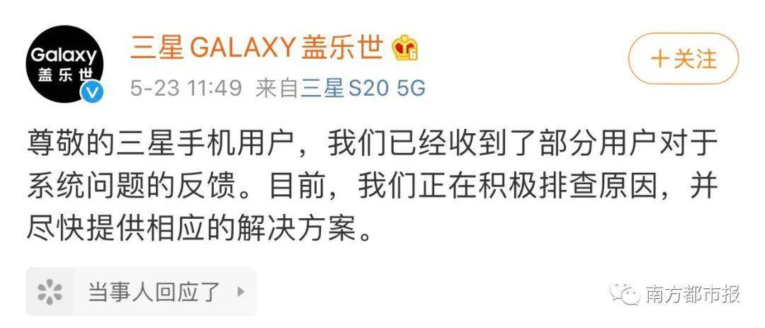 今天11时许,@三星GALAXY盖乐世 对此事也进行了回应。