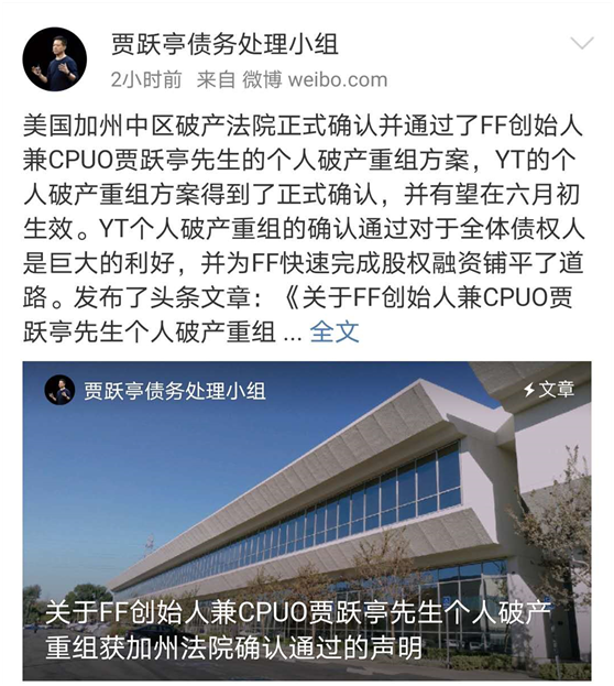 贾跃亭债务处理小组方面表示,贾跃亭对全体债权人尽责到底的努力已经实现了一个重大的里程碑,债权人也距离获得债务偿还更进一步。此外,贾跃亭个人破产重组方案获得法院批准也为Faraday Future(FF)尽快完成股权融资解除最大障碍。