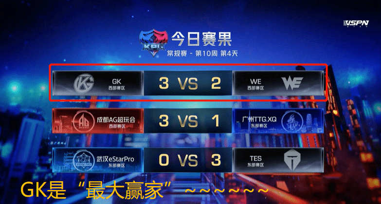 2020年KPL春季赛常规赛第十周第4个比赛日,三场比赛打完之后呢,晋级形势非常混乱的西部赛区,终于迎来了大结局!GK3比2战胜了WE之后呢,他们获得了最后一个晋级季后赛的名额。至此,西部“4争1”的肥皂剧终于结束,GK成了最大赢家,喜提季后赛资格。
