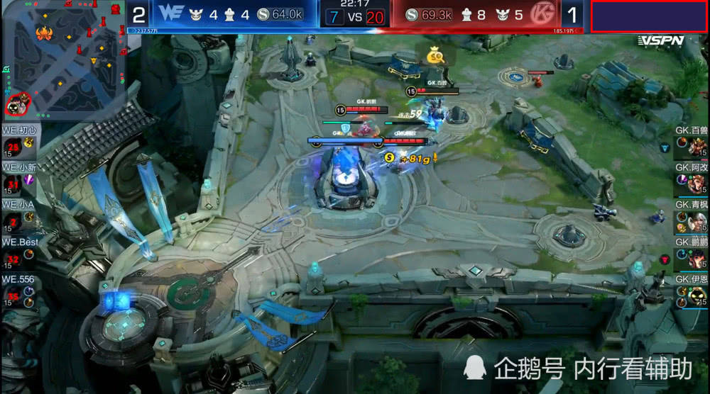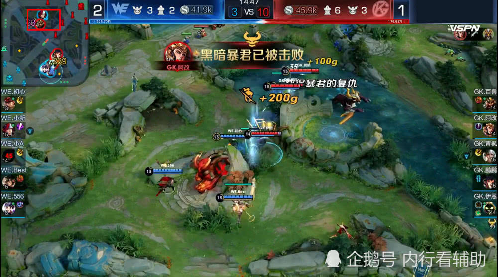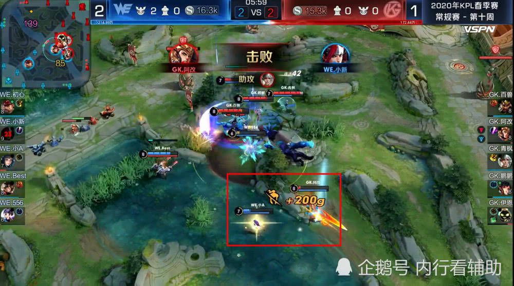 第一,韩信的英雄强度太低,很难克制GK的杨戬。从这局比赛可以看到,WE在前期还是拿到了部分优势,人头也基本上差不多。但这样的优势全部都是队友打出来的,跟韩信没有什么关系。比赛进行到6分钟左右,韩信在GK蓝区控到杨戬,刘邦也给了韩信大招,而这时杨戬利用大招的回血,用丝血对韩信完成了反杀。而这里还有一点就是,这时韩信经济是比杨戬要高500以上的经济的,而这就说明了韩信的个人强度太低,根本打不过杨戬的这个事实。