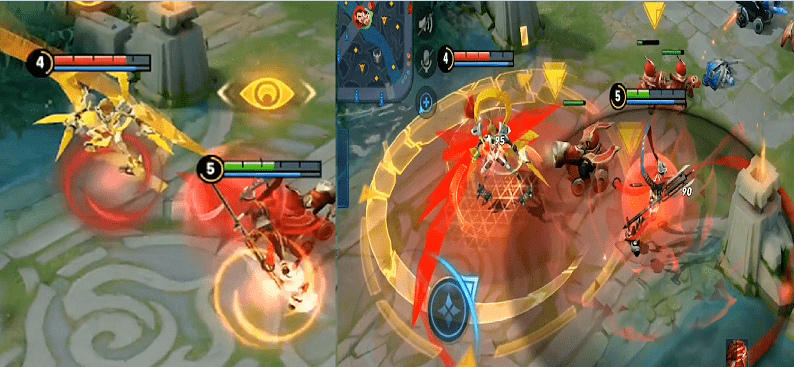 再看看这两款皮肤的二技能特效,KPL特效是金黄色的圈圈,命中后会眩晕敌人。而次元突破开启后也有一个护盾,不仅是红色,周围还会有一朵暗红色的莲花。