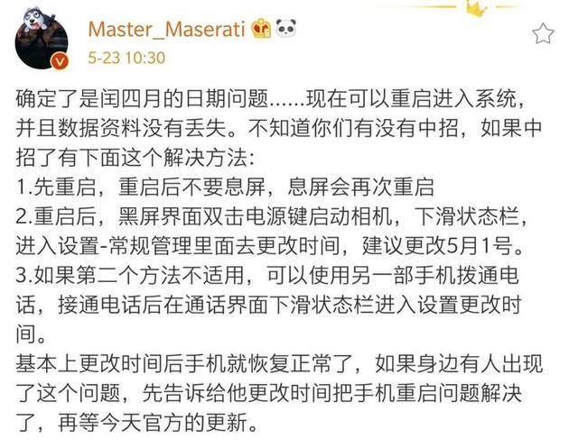 微博数码博主“Master_Maserati“ 表示,三星系统崩溃是因为闰四月的日期问题。不仅如此,该博主还给出了中招后的解决方法(非官方解决方案),具体如下: