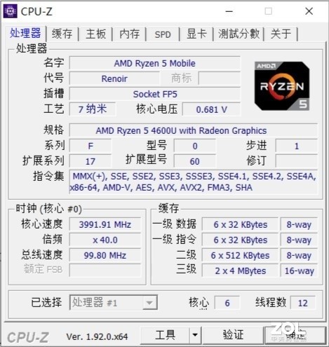 具体来看处理器的规格,AMD锐龙5 4600U为6核心12线程,作为对比,上代的锐龙5 3500U、锐龙7 3700U均为4核心8线程,锐龙5 4600U的物理核心一下子就增加了两个,并且支持超线程技术,这就使得处理器的多核性能有了得天独厚的优势。频率方面,锐龙5 4600U的基础频率为2.1GHz,单核最高4.0GHz,二级缓存3MB,三级缓存8MB,集成6组Vega图形核心,TDP 15W。