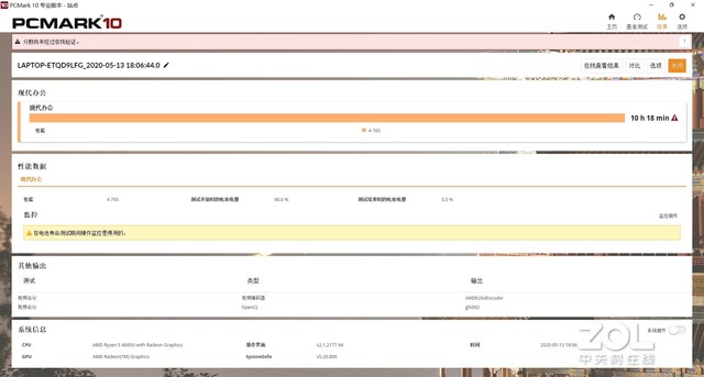 小新Air 14 2020锐龙版将电池容量升级为56.5Wh,电池容量的提升会非常直观地反映在续航时间上,经过测试(PCMark 10现代办公,150cd/㎡亮度,开启WiFi),笔记本的续航时间为10小时18分钟,这个续航成绩绝对可以让笔记本在不插电的情况下使用一整天,可见小新Air 14 2020锐龙版对电源管理的优化程度。