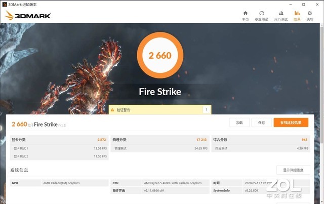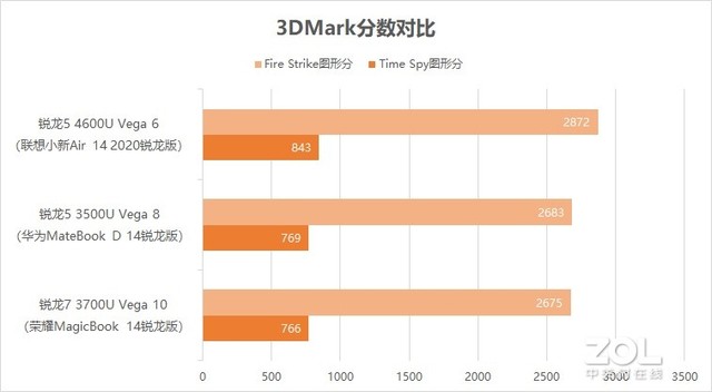 核显方面,锐龙5 4600U集成了6组Vega核心,相比锐龙5 3500U少了两组,但是通过3DMark Fire Strike以及Time Spy的测试来看,锐龙5 4600U的图形分数是要高于锐龙5 3500U的,笔者猜测,核心减少性能提升大概率是来自7nm工艺的红利。