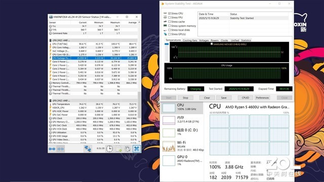 散热方面,小新Air 14 2020锐龙版采用了单风扇双铜管的散热模组,我们用负载较低的Stress CPU(AIDA64 CPU)进行拷机,30分钟后,处理器频率为3.88GHz,温度为90.6℃,功耗约为26W,不得不说,小新Air 14 2020锐龙版对锐龙5 4600U的频率和功耗控制都非常理想,并且此时仅有键盘区域稍有热量,并无过热现象。