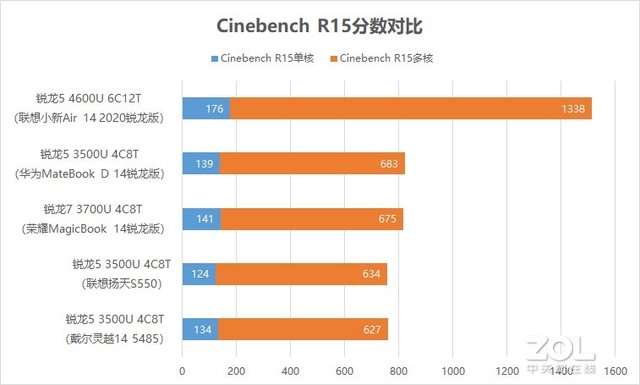 我们通过Cinebench R15进行测试,AMD锐龙5 4600U的单、多核成绩分别是176cb和1338cb,相比上代定位相似的锐龙5 3500U有了质的提升。