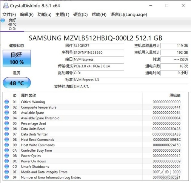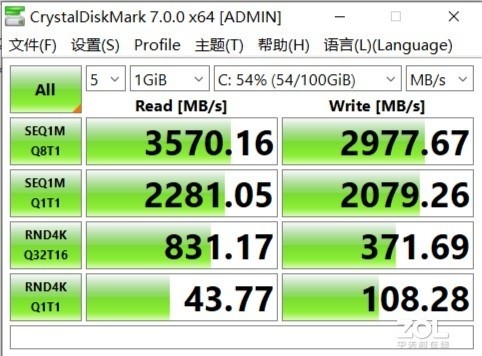其他硬件方面,小新Air 14 2020锐龙版搭载了16GB DDR4 3200MHz双通道内存(板载不可更换),更高的内存容量及频率对于提升系统整体的流畅度都有帮助,硬盘方面配备了512GB PCIe NVMe SSD,传输模式为PCIe 3.0×4,SSD的顺序读写速度(Q8T1)分别为3570MB/s、2977MB/s,随机读写速度(Q1T1)为43MB/s和108MB/s,顺序及随机读写速度均位于SSD中的第一梯队。