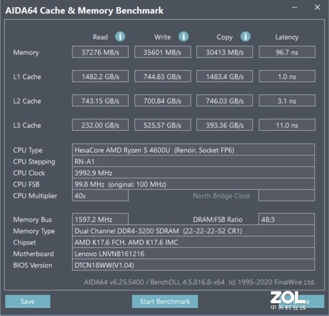 为了更直观地进行对比,我们将数据库中曾经测试过的锐龙5 3500U及锐龙7 3700U的成绩汇总成表格。可以看到,锐龙5 4600U在单、多核方面全部领先锐龙5 3500U及锐龙7 3700U,多核方面因为物理核心数量的增加使得锐龙5 4600U的多核成绩几乎是3500U及3700U的两倍,单核方面因为IPC的提升也让锐龙5 4600U的领先幅度达30%以上。