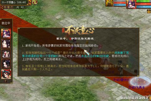 凑齐5个人即可进行游戏。这个玩法其实很简单,凑齐5个人后,大家会在系统的安排下在红色的路线上走动,系统会随机停止走动,大话精灵开始出题,大家需要猜出这个成语,并在20秒以内走到这个成语的任何一个NPC附近,点击该NPC,然后根据提示点击打坐或困觉功能。