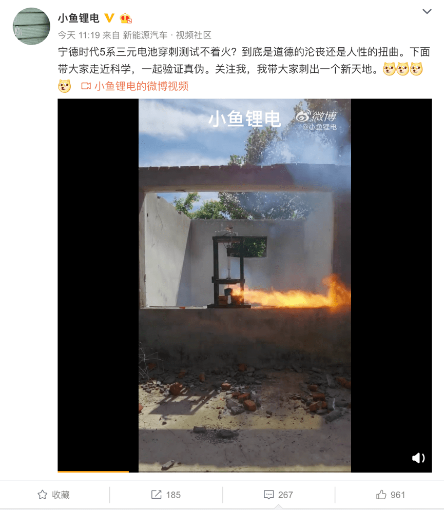 小鱼锂电进行的两次试验,电池模组均出现了明显的起火现象,这一结果与宁德时代公布的视频差距极大。