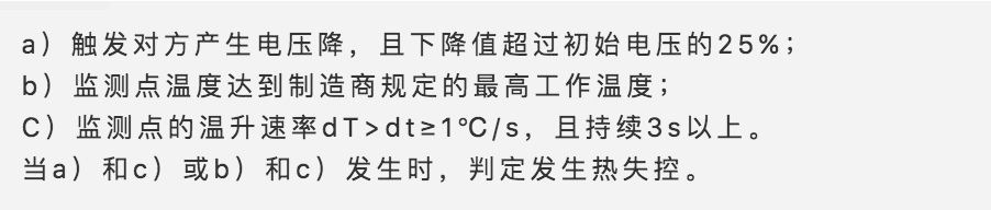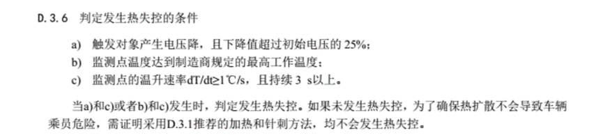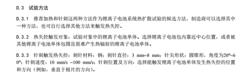 在最新发布的国家强制标准《电动汽车用锂离子动力蓄电池安全要求(征求意见稿)》中,虽然取消了模块级别的所有测试,但是附录D热扩散试验,仍推荐了“针刺”作为候选方法。同时,意见稿还明确了发生热失控的条件: