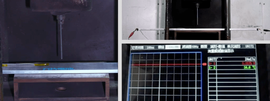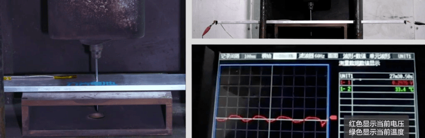除了针刺试验之外,挤压也是模拟电池内短路的一个方法。隔膜被挤压拉伸到一定程度后,失效部位将变成短路点。与针刺试验一样,通过这个短路的瞬时大电流将导致温度急剧上升,容易引发热失控。
