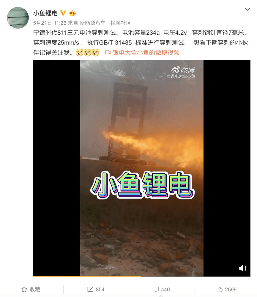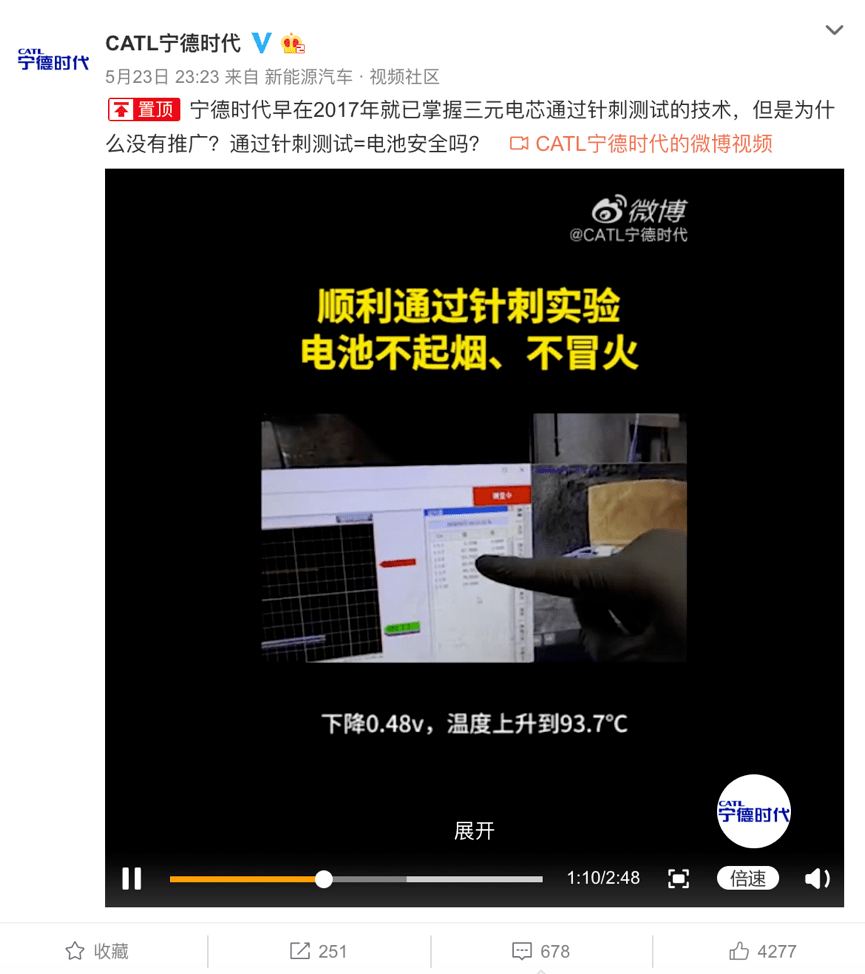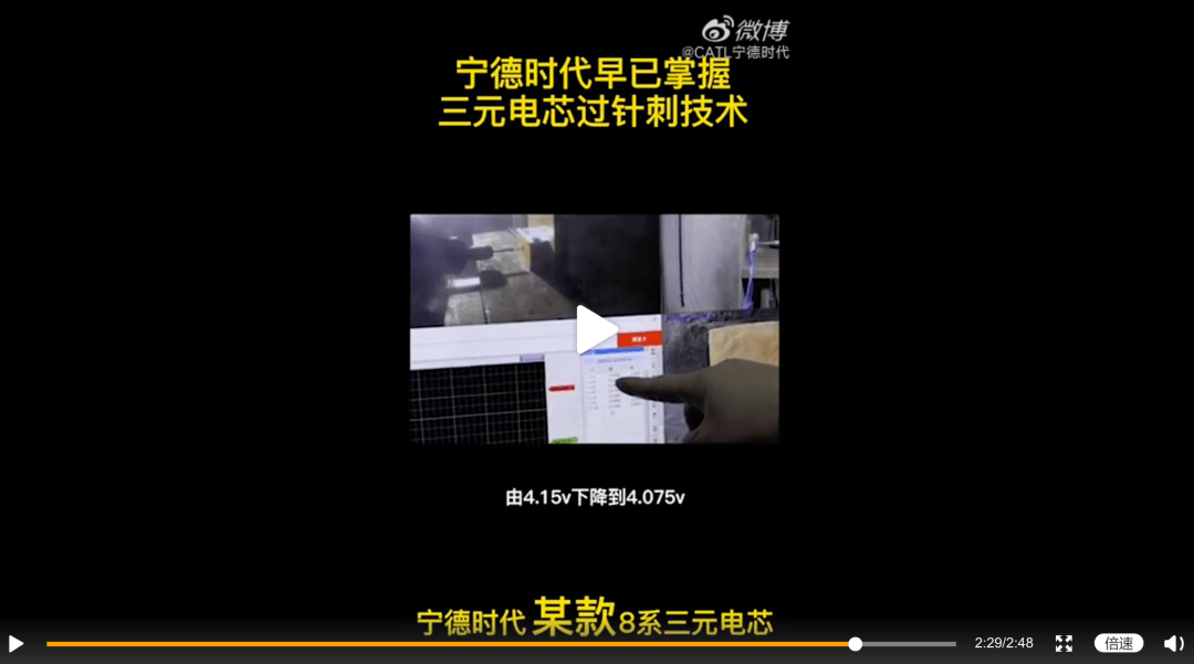5月23日晚,宁德时代在微博发布了第二条针刺试验视频,同时表示:“宁德时代早在2017年就已掌握三元电芯通过针刺测试的技术,但是为什么没有推广?通过针刺测试=电池安全吗?”
