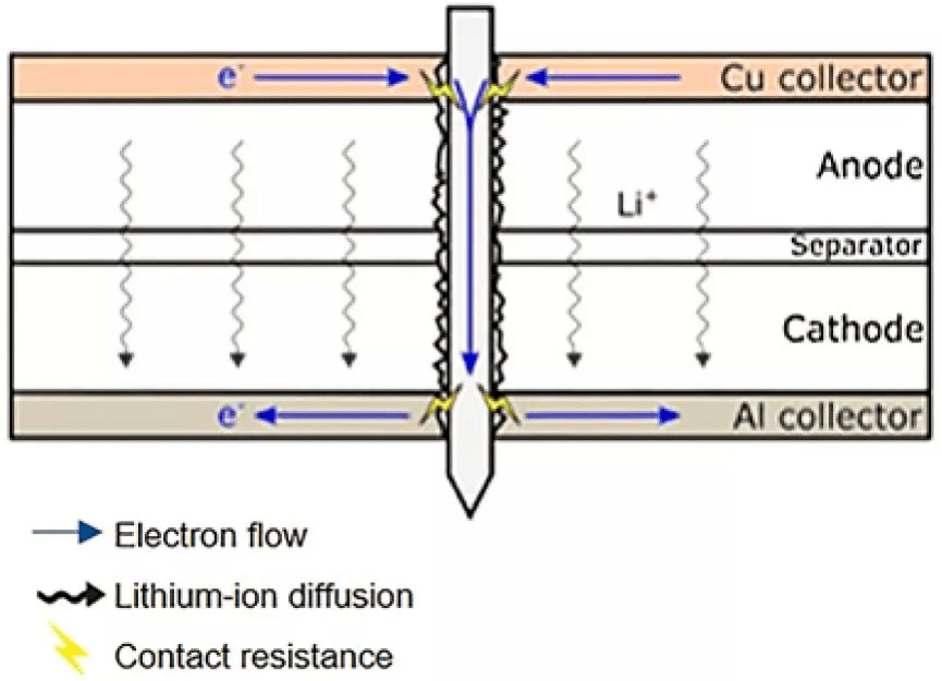 电芯内部是隔膜分隔开的一层层极板,将正负极活性物质分隔开,隔膜被钢针刺穿的位置会变成电芯内部的短路点,整个电芯的电量都将通过短路点进行释放,这时产生的瞬时大电流会导致温度急剧升高、隔膜收缩,从而引发活性物质和电解液的快速分解燃烧,极易出现热失控。