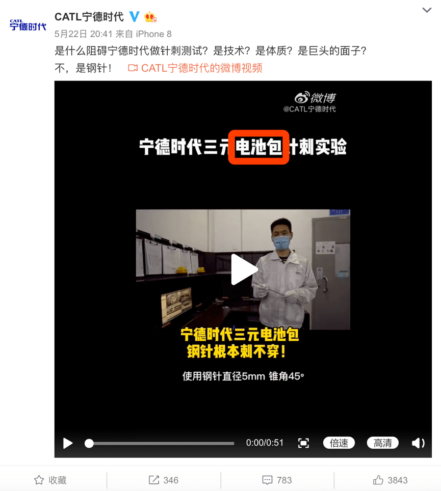 5月22日,宁德时代在微博发布第一条关于针刺试验的视频,配文称:“是什么阻碍宁德时代做针刺测试?是技术?是体质?是巨头的面子?不,是钢针!”。