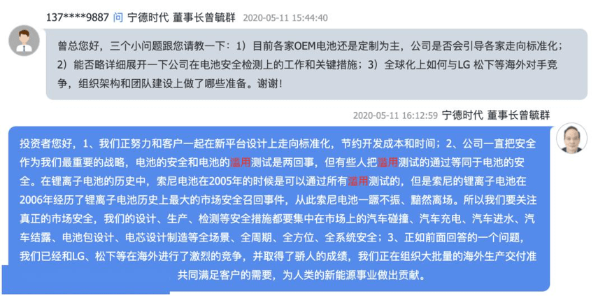 两周前,宁德时代2019年度业绩网上说明会上,有投资者问宁德时代在电池安全检测上的工作和关键措施,宁德时代新能源科技有限公司董事长兼首席运营官曾毓群在回答中提到:“电池的安全和电池的滥用测试是两回事,有些人把滥用测试的通过等同于电池的安全。”