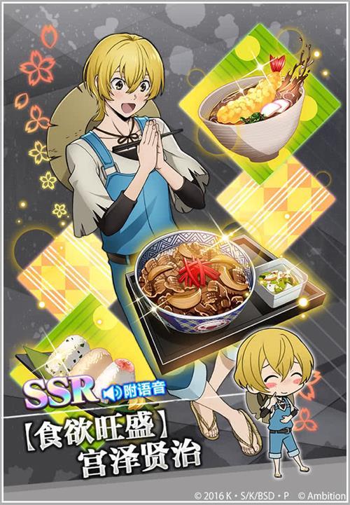 最后要介绍的就是最近即将开启的异能节活动中,全新登场的宫泽贤治SSR卡牌【食欲旺盛】宫泽贤治!这张卡上画得非常精致的牛肉、炸虾、饭团等料理,也确实能让人有食欲大增的感觉。