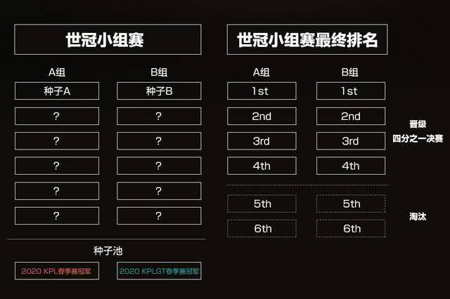 到小组赛才是世冠正赛的开始。小组赛分为AB两组进行组内单循环,BO3全局BP赛制,每支战队需要打5场比赛,最终AB组每组的前四名晋级下一轮比赛,五六名淘汰。分组以抽签的形式产生,KPL&KPLGT的冠军分列两个小组。