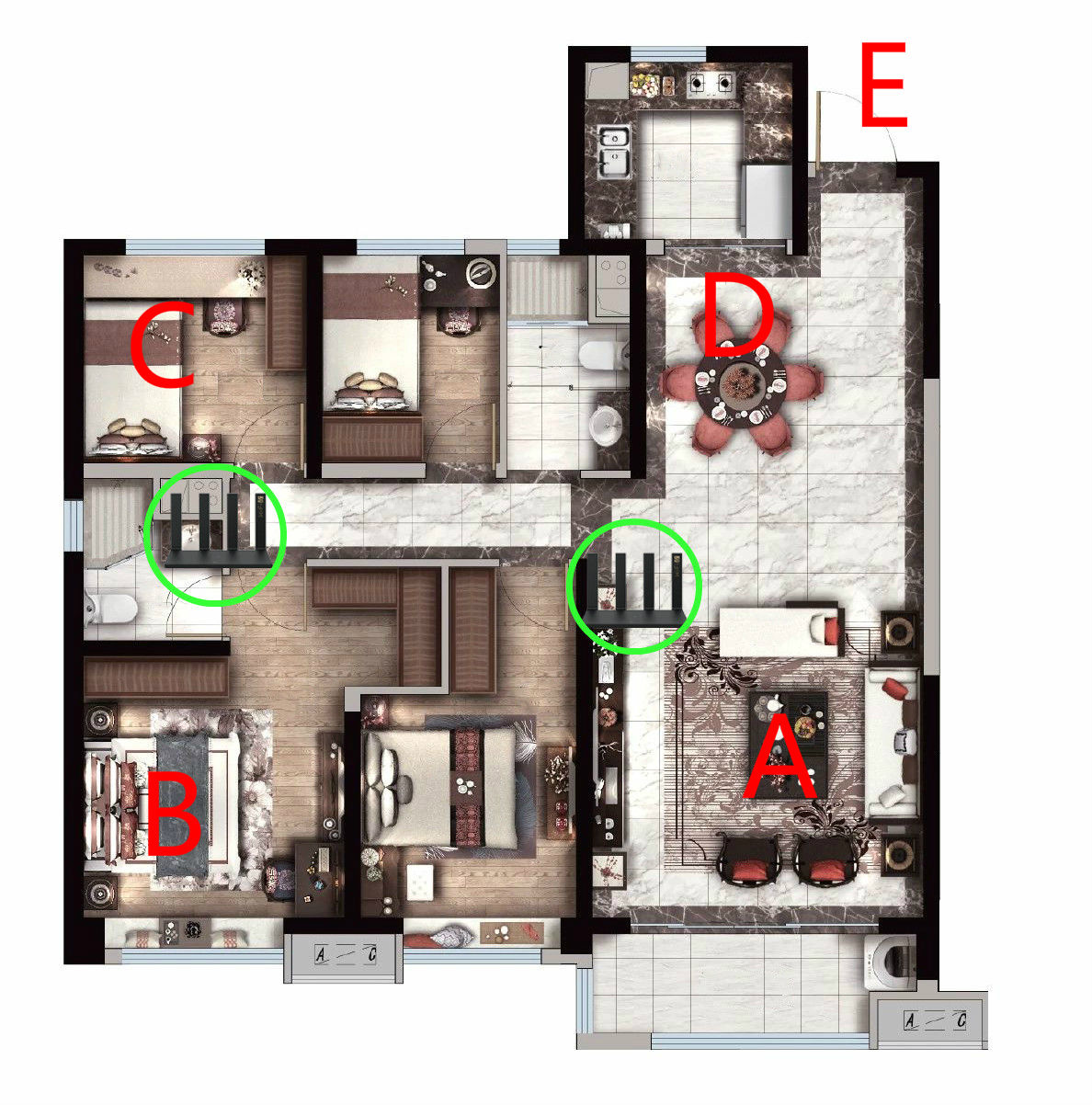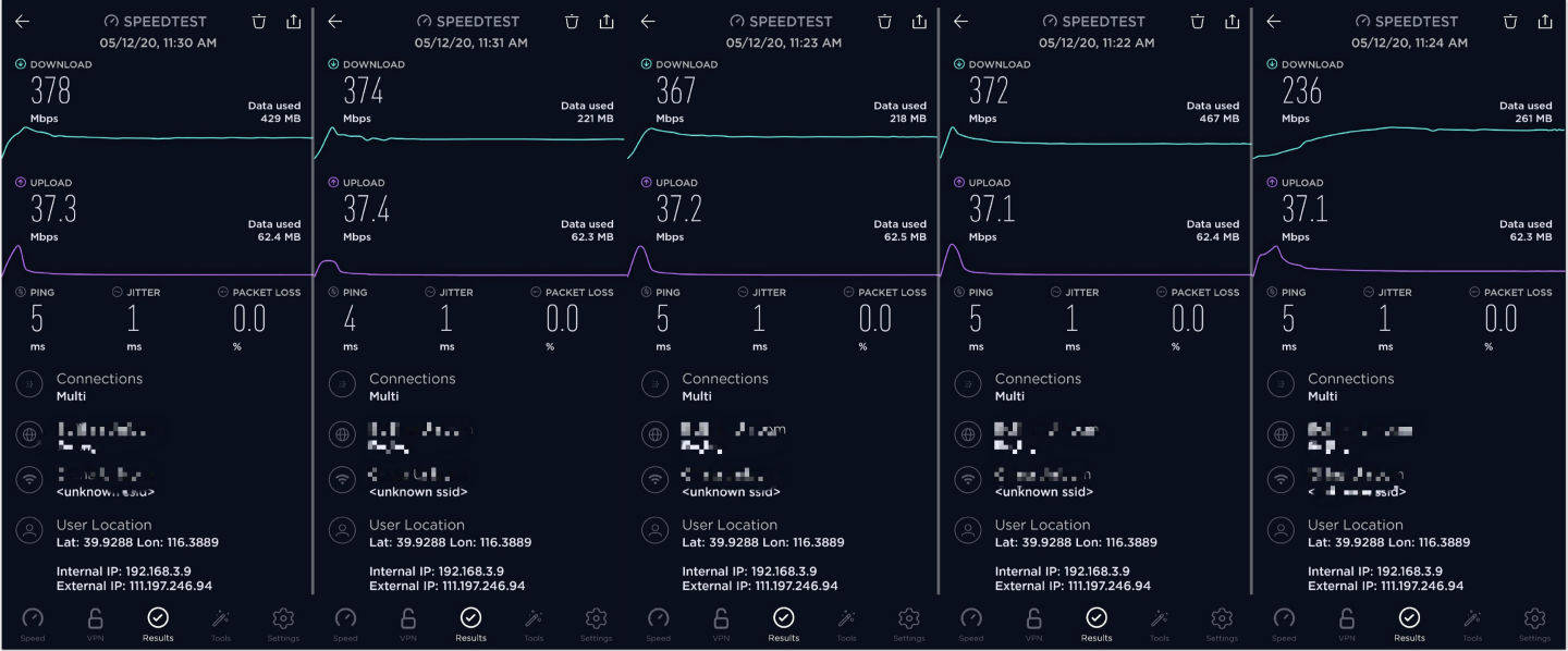 为了更直观的看到WiFi网速情况,我们来实测一下,分别选取家庭活动最多的客厅,主卧,最里面的次卧,饭厅,甚至在门外楼梯间也做了测试,分别对应A/B/C/D/E五个点,用SpeedTest测速。可以看到,室内的WiFi覆盖非常强,测试点都能跑满我家300多兆的宽带,Ping值在5ms左右,抖动几乎都在1ms,全程测速没有出现丢包,可以说表现非常优秀。