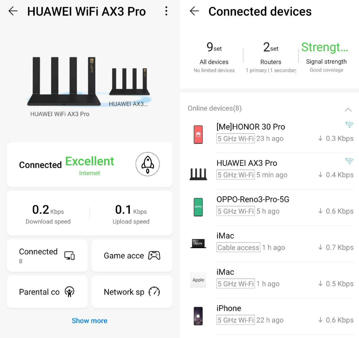 最新发布的华为P40系列,荣耀30系列都支持Wi-Fi6 Plus,这也就是为什么前面测的速度是iPhone的8倍。如果你用的是华为之前的WiFi5手机,它也是向下兼容的。另外华为路由AX3 Pro,可以四核智能调度,让多设备共享同一信道资源,大幅提升多设备连接效率有效降低负载,即使像我这种超多联网设备的用户,多设备连接也不卡。