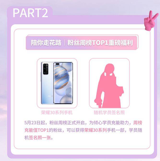 另一方面,粉丝周榜福利也让人眼前一亮。充能Top1的粉丝会直接获得由荣耀30系列送出的新机一部外加学员签名照一张!不知道这样的福利对于粉丝而言是不是足够心动呢?