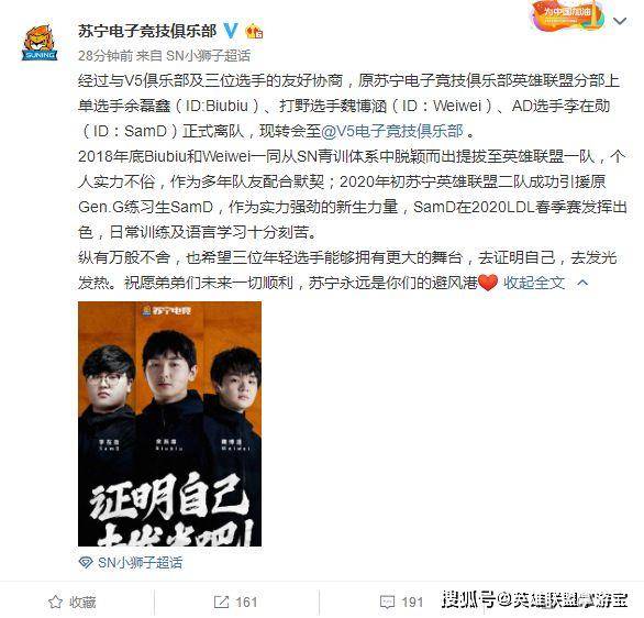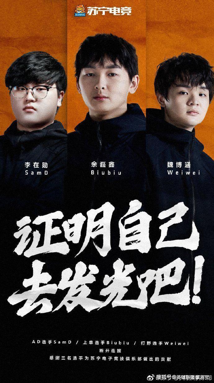 经过与V5俱乐部及三位选手的友好协商,原苏宁电子竞技俱乐部英雄联盟分部上单选手余磊鑫(ID:Biubiu)、打野选手魏博涵(ID:Weiwei)、AD选手李在勋(ID:SamD)正式离队,现转会至@V5电子竞技俱乐部 。
