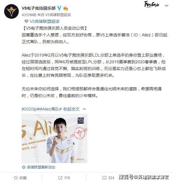 因尊重选手个人意愿,经双方友好协商,原V5上单选手黄浩(ID:Aliez)即日起正式离队,目前为自由人。