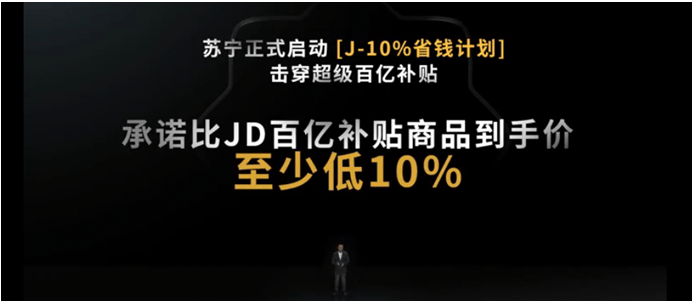 顾伟宣布,苏宁将在本次618启动“J-10%”省钱计划,承诺针对家电、手机、电脑、超市类目,比京东百亿补贴商品到手价,至少再低10%,“欢迎友商来比价,也请媒体朋友监督。”