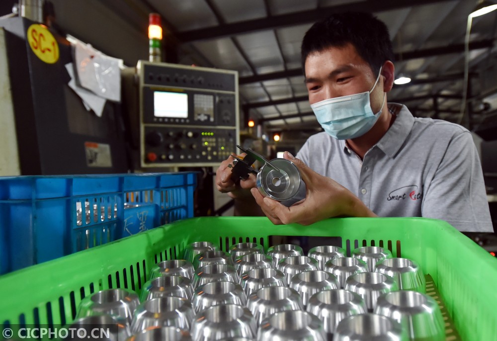 ↑2020年5月20日,江苏省扬州市一渔具小微外贸企业的质检员对加工后的渔具零部件进行抽检。CICPHOTO/庄文斌 摄