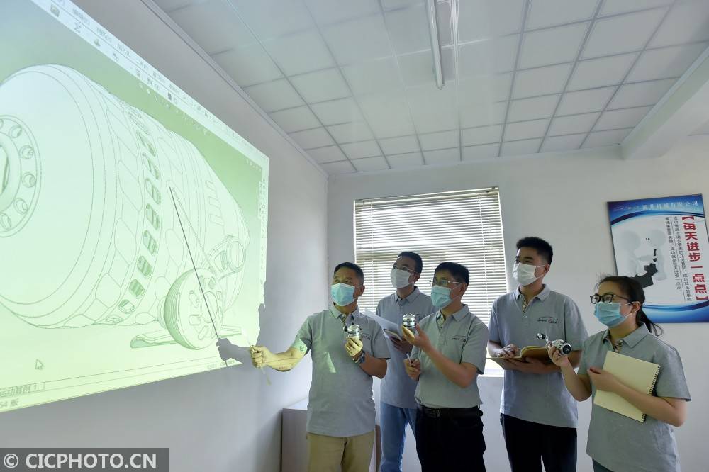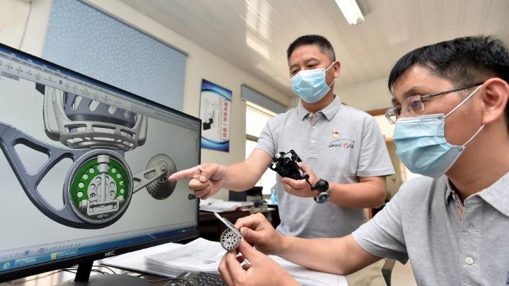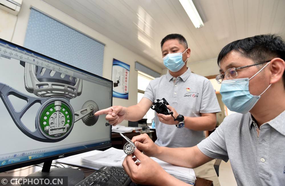 ↑2020年5月21日,江苏省扬州市一渔具小微外贸企业的研发人员对新产品内部功能结构进行技术创新攻关。CICPHOTO/庄文斌 摄