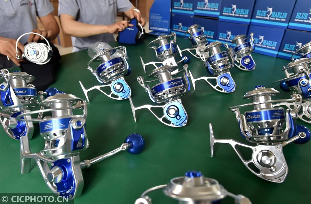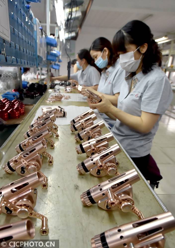 ↑2020年5月20日,江苏省扬州市一渔具小微外贸企业的工人在组装外贸订单产品渔线轮。CICPHOTO/庄文斌 摄