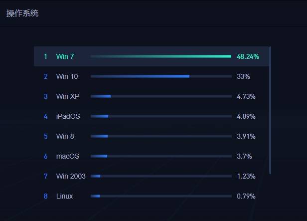 根据图表的信息显示,除Windows 7系统以外,Windows 10目前的份额也达到了33%,其次是Windows XP,份额为4.73%,iPadOS占据4.09%份额,Windows 8系统占据3.91%份额,macOS占据3.7%份额,Windows系统在国内仍然占统治地位。