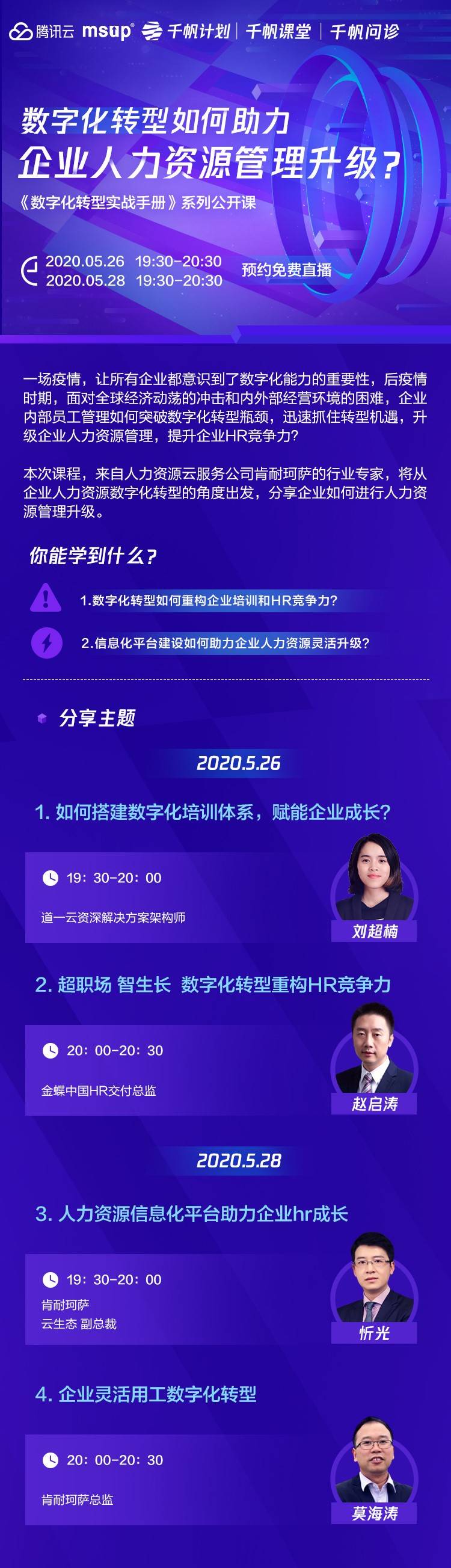 5月26日、28日两天,腾讯云联合msup邀请到了道一云资深解决方案架构师刘超楠、金蝶中国HR交付总监赵启涛、肯耐珂萨云生态副总裁忻光、肯耐珂萨总监吴海涛,四位讲师将为大家分享如下话题。