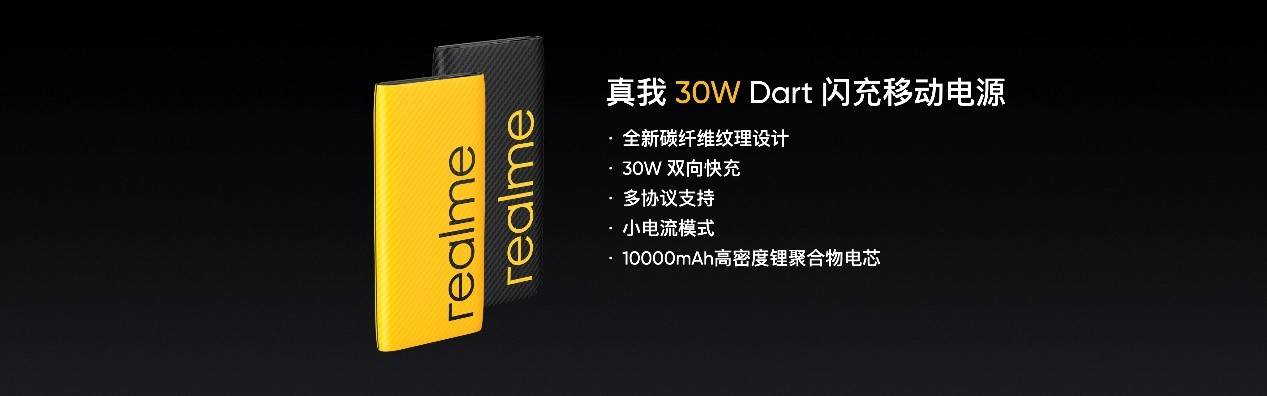 realme 真我30W Dart闪充移动电源采用碳纤维纹理设计,支持realme独有30W Dart双向闪充。两款产品都具备黄色和黑色两种最为经典的realme专属配色,搭载10000mAh高密度聚合物锂电池;售价为199元,将于6月12日0点正式开售。