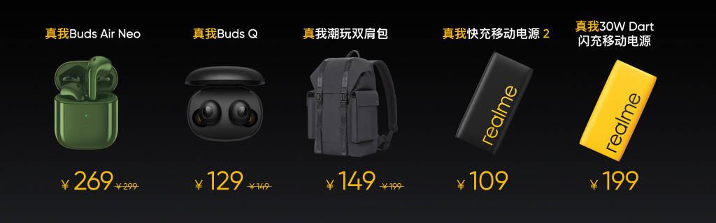 此次发布会带来5款周边产品,分别是真我BudsQ、真我Buds Air Neo、真我快充移动电源2、真我30W Dart闪充移动电源和realme真我潮玩双肩包,官方称之为“潮玩五人组”。