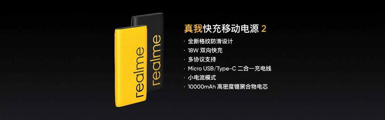 realme 真我快充移动电源2支持18W快速双向充电及多种快充协议,支持小电流模式,能够为各种AIoT产品充电;售价为109元,5月25日17点开售。