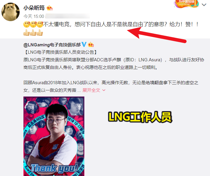 不仅如此,阿修罗被宣布离队后,LNG的前工作人员也出来“阴阳怪气”一顿,他转会评论LNG官博内容:不太懂电竞,想问下自由人是不是就是自由了的意思?给力,赞!作为一个电竞俱乐部的工作人员,他怎么可能不明白自由人是什么意思,很明显这条动态就是为阿修罗庆祝,认为他的离开很好、很给力。