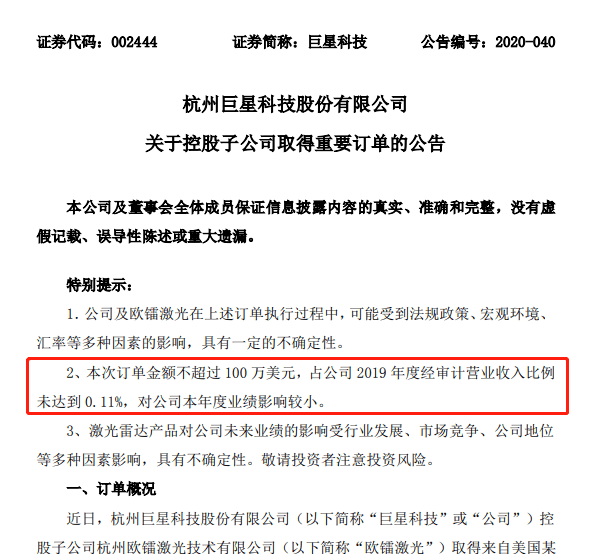 5月25日晚间,杭州巨星科技股份有限公司(股票简称:巨星科技,股票代码:002444)发布公告称,近日公司控股子公司杭州欧镭激光技术有限公司(以下简称:欧镭激光)取得来自美国某公司的重要订单,订单标的为小型激光雷达(Mini Lidar), 订单数量1000 台,订单金额不超过100万美元,占公司2019 年度经审计营业收入比例未达到 0.11%,但超过公司2019年激光雷达产品收入的 100%。