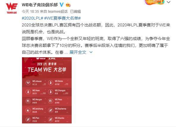 【WE官宣夏季赛名单:保留原班人马 上调新人中单】