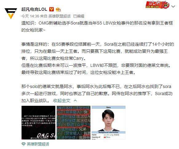 另外给大家讲个温知识:OMG新辅助选手Sora就是当年S5 LBW女枪事件的那名没有拿到王者框的女枪玩家。。。