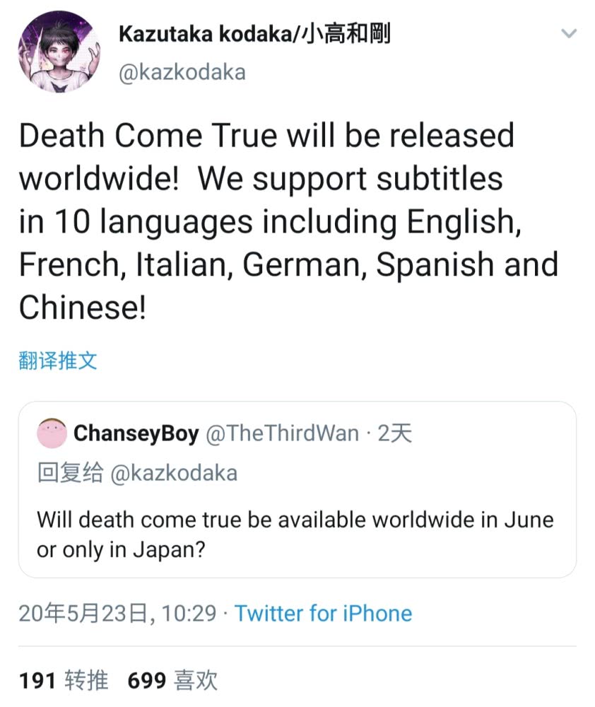 小高和刚在推特确认,互动电影新作《死亡成真 Death Come True》不仅限日版,也将面向其他各服发售,支持包含简繁中文在内的10种语言,本作将于6月登录Switch,售价1900日元。
