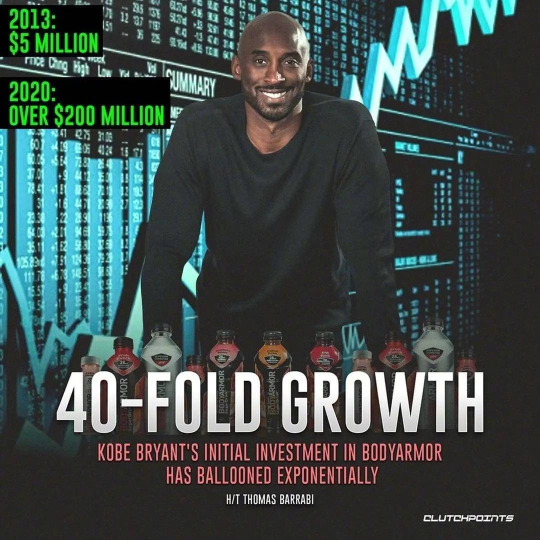 在科比的努力下,BodyArmor很快签下了哈登等一系列代言人。2018年,公司成功被可口可乐收购,市值暴涨至20亿美元,成为运动饮料行业的新贵。老科所持股份的价值增至2亿美元,仅用5年就暴涨了40倍!