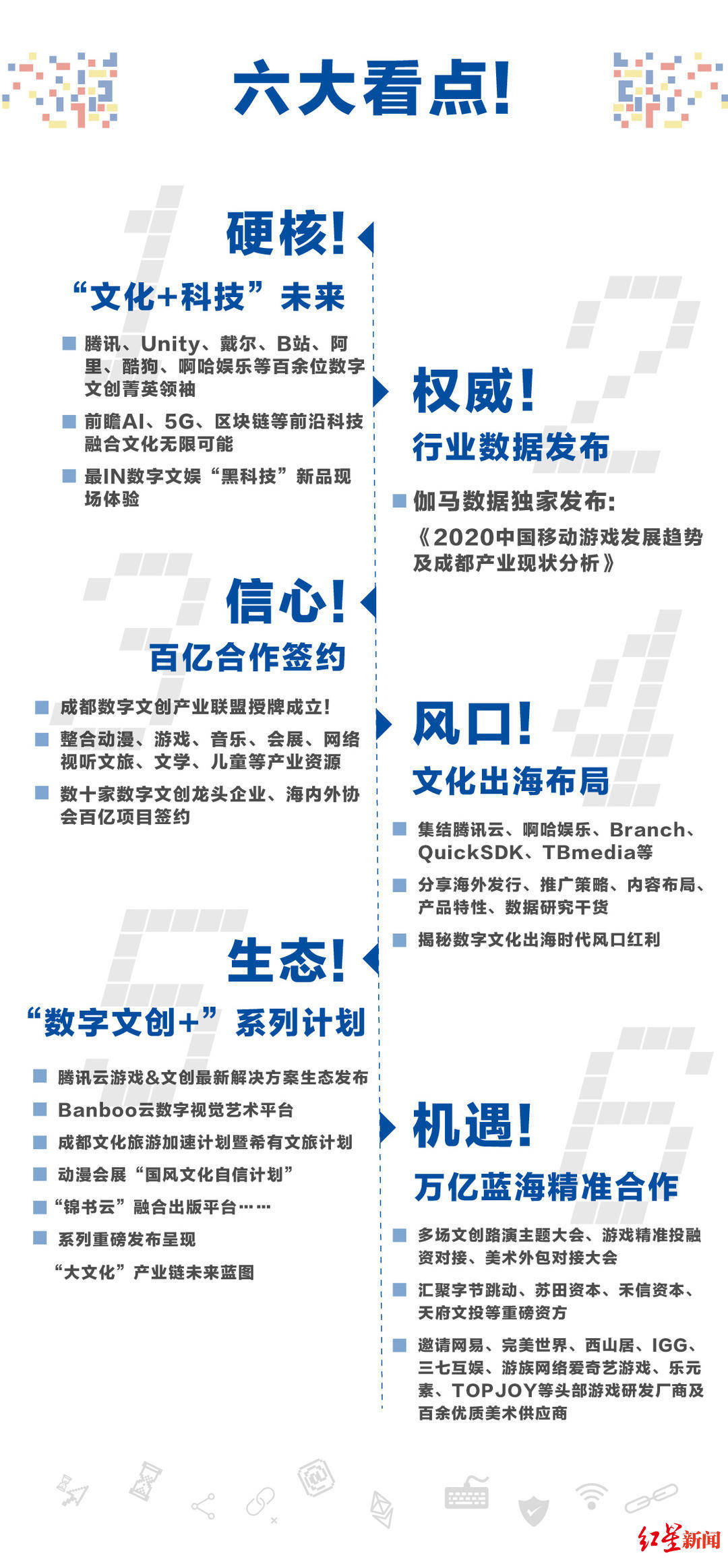 红星新闻记者了解到,大会涵盖了13场影视、动漫、云游戏、AI、网络视听、数字版权、会展等领域的产业高峰论坛、全球开发者大会、投融资峰会以及国内外知名动漫、游戏、影视的国际IP及衍生品版权交易展等系列活动,将促进5G、人工智能、区块链等前沿技术产品与数字文创融合应用,搭建聚合全球数字文创顶级业态的合作生态平台。