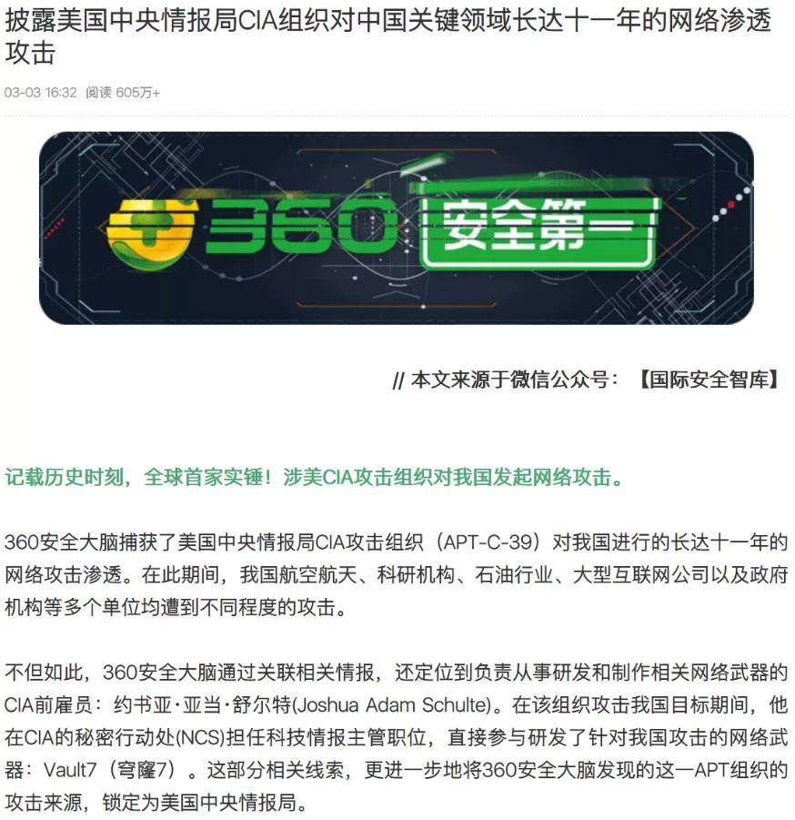 3月3日,306发布一条信息,揭开了美国中央情报局对中国长达11年的网络渗透的攻击行为,这则新闻被认为是360被制裁的原因之一。因为,360在网络安全领域,其发展起来的技术,已经威胁到了美国在关键领域的领导地位,这是重中之重。