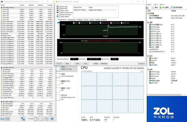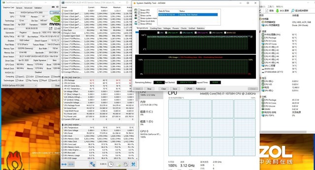 双烤测试采用Furmark+AIDA64两个软件,其中Furmark的设置为1080P、8xMSAA;AIDA64的设置为Stress FPU,测试时长为30分钟。30分钟之后,i7-10750H的频率稳定在3.12GHz,功耗稳定45W,最高温度92°;NVIDIA GeForce RTX 2060的频率为1530MHz,功耗80W左右,最高温度74°。