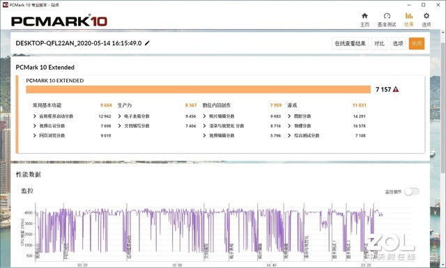 最后是整机性能测试,使用PCMARK 10 Extended模式进行测试,得到总分7157,其中常用基本功能为9654分、生产力为8367分、数位内容创作为7959分、游戏为11031分。从得分分布来看,机械师F117-V的游戏性能很出色。